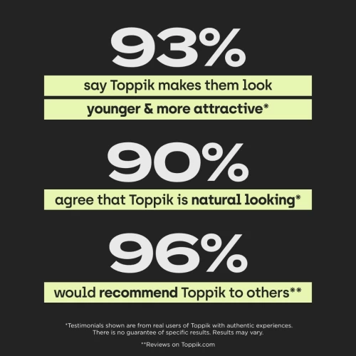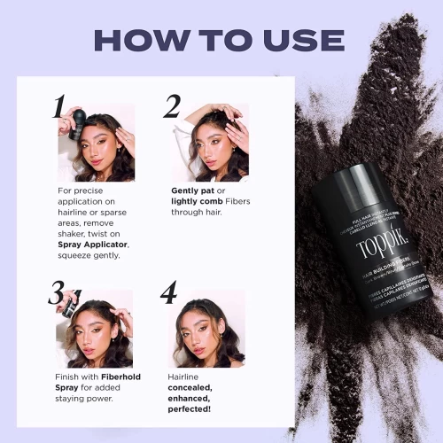 | طريقة الأستخدام | - نجفف الشعر تمامًا قبل استخدام ألياف توبيك - يتم هز العبوة جيدًا وتثبيتها على المنطقة المراد الرش فيها والتأكد فى المرآة أنها المنطقة الصحيحة - نحرص ألا تلامس تلك الألياف الجبهة - نقوم بالمسح على الشعر وتوزيع الألياف فيه بشكل متناسق - نتأكد أننا لا نحتاج المزيد ثم نمشط شعرنا بخفة لظهور كثافته |